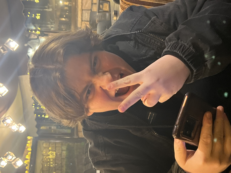 A young adult, with medium-length dark brown hair parted down the middle, is depicted in an indoor setting within the city of Rukn ad-Din Municipality, Syria. The individual is wearing a black collared jacket over a dark-colored garment, possibly a hooded sweatshirt, with a small white emblem visible on the chest area of the inner layer. The person faces forward, looking directly at the viewer with an exaggerated, open-mouthed expression. The left index finger is pressed against and elevating the tip of the nose. The right hand is raised, forming a V-sign with the index and middle fingers extended. A dark-colored smartphone, featuring a rear camera module, is held in the lower portion of the left hand. The background is dimly lit, revealing several geometric light fixtures suspended from the ceiling and decorative string lights, including star shapes, visible through a window or glass partition. A patterned, upholstered chair or booth back is partially visible to the right.