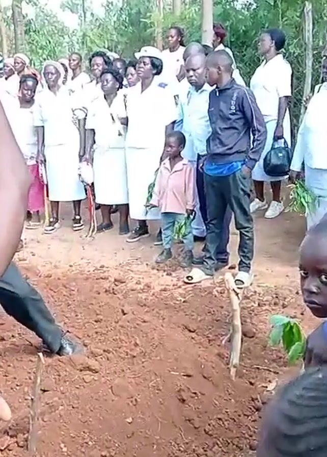 The video depicts a funeral scene. A group of people stands near a freshly dug grave. Many of the adults wear white uniforms. A man is digging into the grave with a shovel. A small child is standing near the grave. The environment appears to be a wooded area. Music is playing.