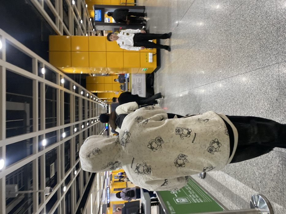 The image depicts an indoor public transit station, identified as a subway station in Panyu District, Guangzhou, China. A queue of individuals is observed moving from the foreground toward the background on a light grey, speckled tiled floor. The closest individual to the camera is viewed from the back, wearing a light-colored hooded sweatshirt patterned with black cartoon bears and the text "STUSSYED" repeatedly, along with black trousers. Directly in front of this person, another individual wears a dark backpack and a light-colored jacket. To the right of the queue, a uniformed male security guard, dressed in a white collared shirt with an emblem on the left shoulder and black pants, stands stationary, facing the direction of the queue's movement. The station environment features a ceiling with an exposed grid of white metal beams and integrated circular lighting fixtures. A series of prominent, bright yellow square support pillars line the right side of the hall. Green barriers with white text, partially obscured, delineate the queuing path on the left. In the mid-ground, multiple security screening arches (metal detectors) are visible, along with manned service counters and additional blue and green signage displaying Chinese characters. A surveillance camera is mounted overhead on the ceiling structure.