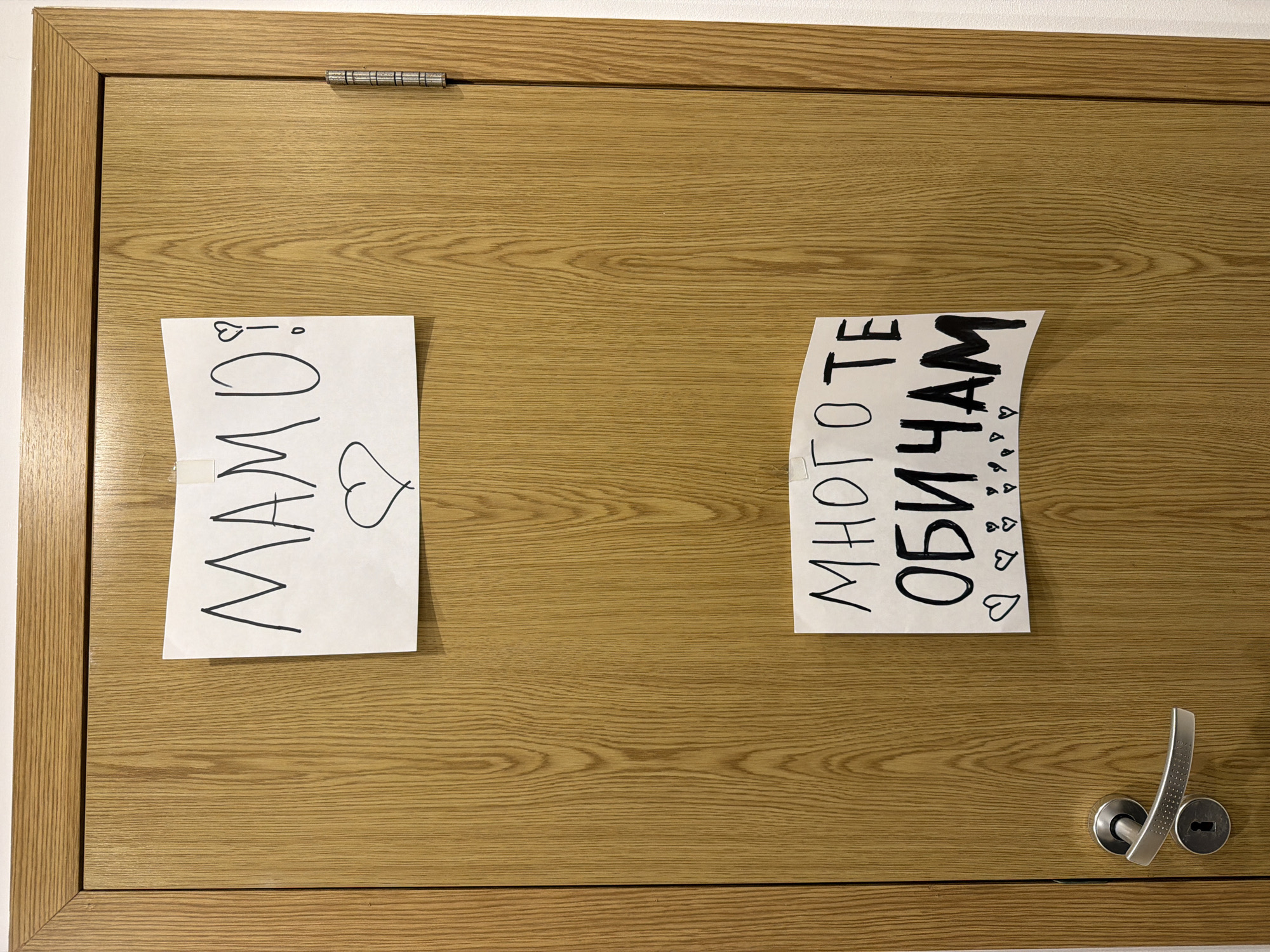 A tan-colored wooden door with a silver handle and lock is adorned with two white pieces of paper attached with tape. The paper on the left has the word "МАМО!" written in black marker, followed by a heart symbol. The paper on the right has the phrase "МНОГО ТЕ ОБИЧАМ" (also in black marker) written vertically, accompanied by several heart symbols. These are words or phrases in Bulgarian.