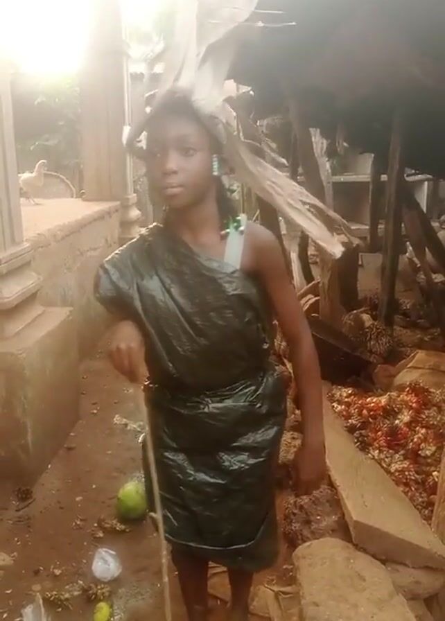 young girl standing in a cluttered outdoor area. She is wearing a dark green plastic garbage bag fashioned as a dress and a headdress made of light-colored material. She is holding a stick, using it as a walking cane. The ground is muddy and littered with debris, including a green fruit, pieces of trash, and organic matter. In the background, there are dilapidated structures made of wood and metal sheets. There's also a white dog visible in the distance. The lighting is bright, but there are areas of shadow. The girl is looking directly at the camera with a neutral expression.