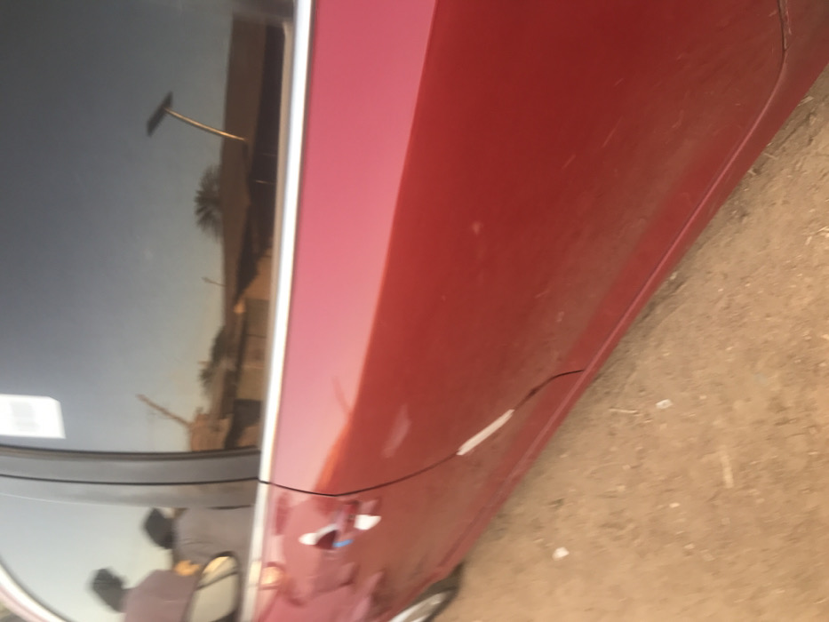 The image displays the driver's side of a red sedan situated on an unpaved dirt surface in Sardauna, Nigeria