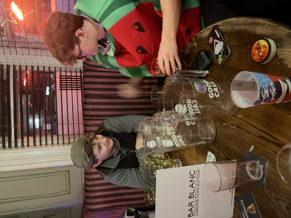 The image depicts an interior scene at Bar Blanc, located on Osborne Road in Jesmond, Newcastle upon Tyne, United Kingdom. Two young males are seated at a wooden table within a booth featuring striped maroon upholstery. The individual on the left, wearing a grey long-sleeved shirt, a dark vest, and a green flat cap, smiles and looks towards the person on the right. His right arm rests on the table. The individual on the right, wearing eyeglasses and a green and red watermelon-themed costume, gestures with a blurred right hand while holding a patterned glass containing a dark liquid in his left hand. His head is turned towards the left individual. The table is cluttered with several clear plastic pitchers, each branded "F Good Call," most appearing empty or containing minimal liquid. Multiple clear drinking glasses are present; some are empty, others contain small, multi-coloured spherical objects. A pint glass rests inverted on a "Guinness" branded coaster. Other items on the table include a white sign displaying "BAR BLANC OSBORNE ROAD JESMOND," another "Guinness" coaster, a cylindrical object with a blue, red, and white design, a circular orange and white tin labeled "VELO," a black smartphone with a clear case and stickers, and a black sunglasses case. In the background, a window with horizontal blinds reveals a blurred exterior, illuminated by a warm red/orange light. The overall environment suggests a social gathering in a bar or pub.