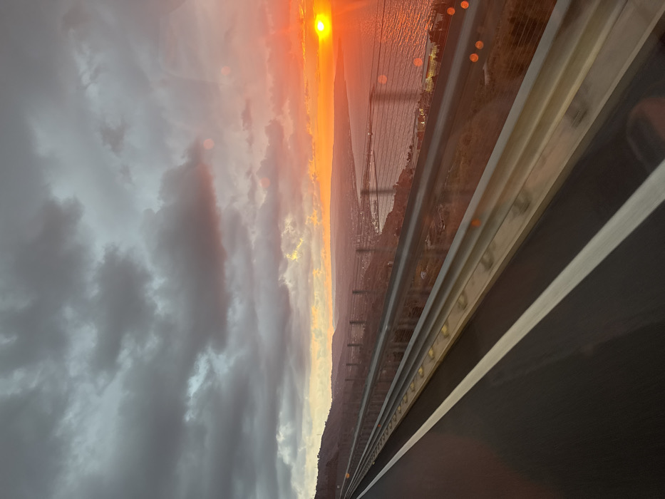 An elevated viewpoint reveals a sunset over the coastal city of Pizzo, Italy. In the foreground, a dark asphalt road with two solid white lane lines extends diagonally from the lower left towards the upper right. Immediately to the right of the road, a silver metal guardrail with yellow reflective markers runs parallel to the roadway. Below and to the right of the guardrail, a vegetated hillside descends steeply towards the sea. A multi-strand wire fence system is visible along this slope. In the midground, the urban area of Pizzo and its surrounding settlements are visible along the curved coastline of a bay, with numerous lights illuminating buildings and streets. The sea, reflecting the vibrant sunset, occupies the right side of the frame, exhibiting a smooth, reflective surface. The background is dominated by a dramatic sky. Heavy, dark grey clouds extend across the upper left and central portions, gradually transitioning into brilliant orange, red, and yellow hues towards the horizon on the right. The sun, a luminous orange sphere, is intensely bright on the far right horizon, casting a strong, elongated reflection across the water. Hills and indistinct landforms are silhouetted against the sky in the far left background. No individuals or active subjects are discernible within the frame. Orange lens flares are present in the lower right portion of the image, suggesting capture through a pane of glass.