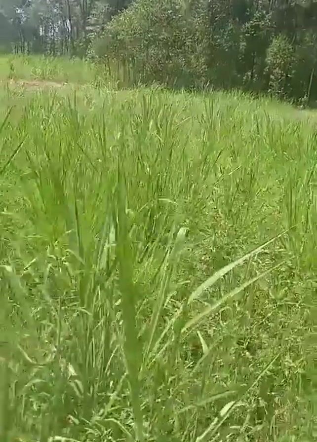 field of tall, green grass. In the background, there is a line of trees. The sky is partly visible above the trees. The camera is relatively still, offering a steady view of the grassy field.
