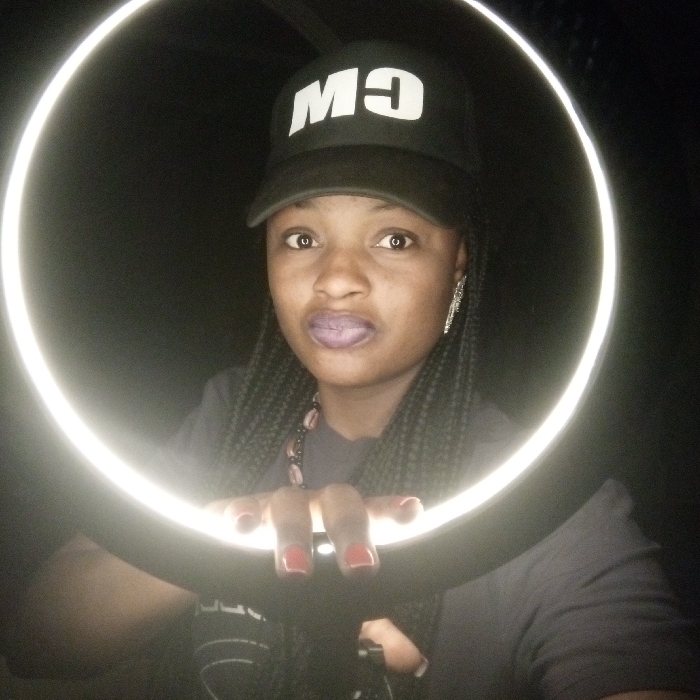 A woman with braids is seen through a ring light. She wears a black baseball cap with the letters "CW" in white. Her lips are painted with a lavender shade of lipstick. She wears a dark-colored top and holds the ring light with her hands, which are painted with red nail polish. The background is black.