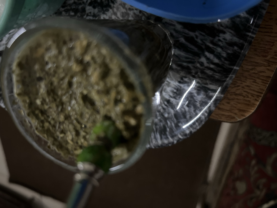 - "A close-up, tilted view shows a glass filled with a coarse, brownish-green substance, possibly yerba mate" by FM-QTxZm1, licensed under CC BY 4.0
