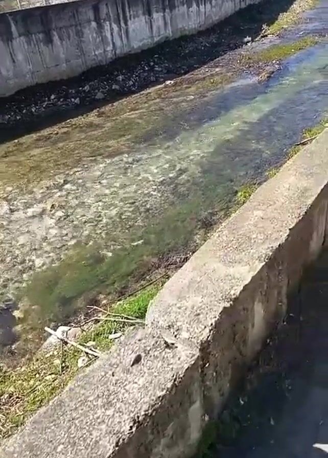 A video shows a concrete canal with water flowing through it. The canal is lined on both sides with concrete walls and has a sidewalk next to one of the walls. Some trash, vegetation and debris are visible inside the canal. In the background, there are buildings, trees, and a mountain range. The sky is blue and clear.