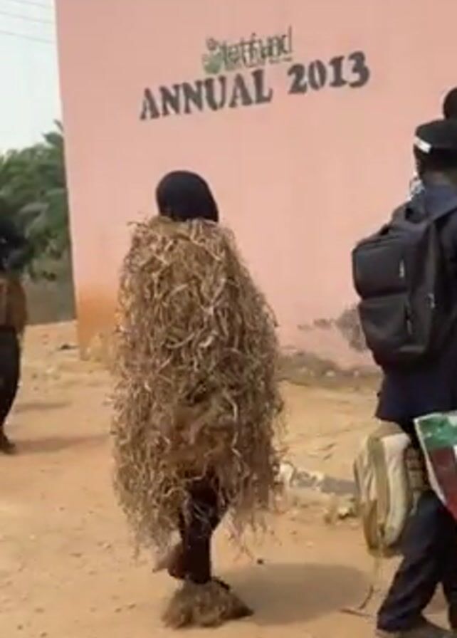 two people in costumes walking on a dirt road near a building with a sign that says "Tetfund Annual 2013". One person is wearing a suit made of brown straw, while the other has their body painted black and is wearing a blue head covering. A third person in a blue uniform walks past with a bag. The scene appears to be taking place outside in a rural or semi-rural area, with trees visible in the background.