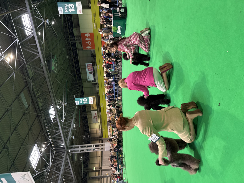 This image depicts an indoor dog show event occurring at the National Exhibition Centre (NEC) in Marston Green, Solihull, within the Metropolitan Borough of Solihull, United Kingdom. The scene is set in a large exhibition hall characterized by a high, exposed metal truss ceiling with integrated skylights and artificial lighting. The floor is covered with a bright green carpet, demarcating a competition ring. Overhead banners display "Ring 10" and "Ring 13", along with sponsor logos such as "Royal Canin" and "Crufts". In the foreground, three female dog handlers are kneeling on the green carpet, each attending to a poodle. From left to right: 1. A woman with reddish-brown hair, wearing a light tan tailored jacket and skirt, has a competitor number "13242" pinned to her back. She is kneeling and gently positioning a dark grey or black poodle with a sculpted show clip. 2. A second woman, dressed in a bright pink blazer and a white skirt, kneels behind a black poodle with a sculpted show clip, positioning it with her hands. 3. A third woman, wearing a pink and white plaid jacket and matching trousers, is also kneeling, adjusting a black poodle with a sculpted show clip. All three poodles are medium-sized and groomed in a traditional show style. In the midground and background, a large crowd of spectators is seated in rows of chairs, observing the event. Additional signage, including "Food Express" and a disabled access symbol, is visible on banners. The handlers' actions suggest they are presenting their dogs for judging in a competitive setting.