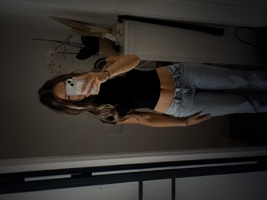 This image depicts an individual taking a mirror selfie in an indoor setting within Oltiariq, Uzbekistan. A female subject with long, wavy brown hair and highlights, partially obscuring her face, stands facing a mirror. She is wearing a black, short-sleeved, high-neck crop top, exposing her midriff, and light blue, low-rise jeans. Her right hand holds a light-colored smartphone with a decorated case at chest level, capturing the image. Multiple thin bracelets are visible on her left wrist. The background, reflected in the mirror, shows light-colored walls. To the subject's right, a white dresser or cabinet is visible, topped with a potted plant featuring white flowers (likely an orchid) and a tall, narrow decorative element, possibly dried pampas grass, in a vase. To the subject's left, a dark-framed door or doorway with glass panels is visible. The overall lighting is dim, suggesting an interior domestic environment. No other individuals or interactions are present.