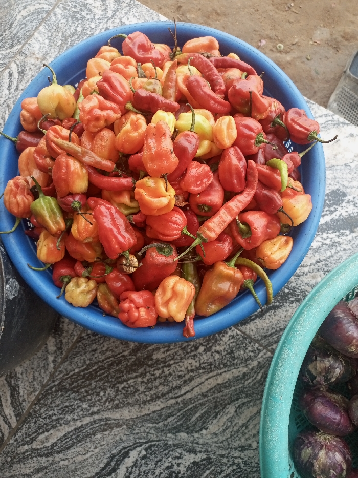 A bright blue plastic bowl overflows with a colorful mix of peppers. Habanero peppers in shades of orange, red, and yellow are interspersed with longer, thinner red chili peppers. The peppers are various sizes and shapes, some smooth and others with a more wrinkled appearance. Beside it, a teal bowl contains a bunch of red onions. The surfaces underneath are gray and patterned.