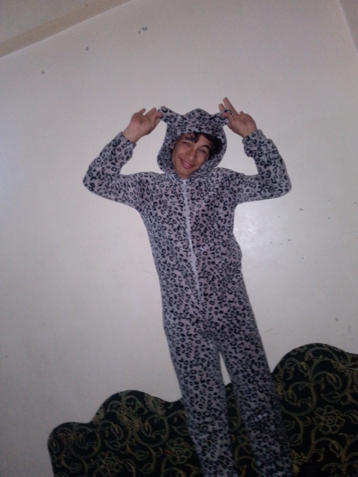 - "A person wearing a hooded, grey leopard print onesie poses for the camera" by FM-OBPce2, licensed under CC BY 4.0