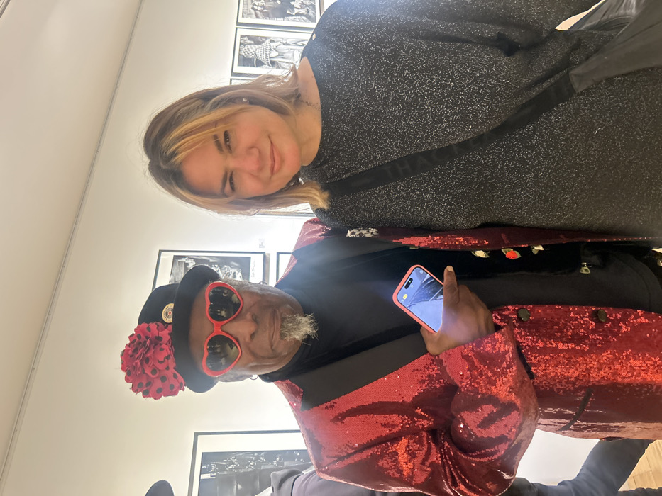 A woman and a man stand close, posing for a picture inside an art gallery. The woman has shoulder-length blonde hair and wears a gray speckled sweater. The man, dressed in a shiny red sequined jacket, black hat with a red flower, and heart-shaped red sunglasses, holds a smartphone. Black and white photos hang on the white wall behind them.