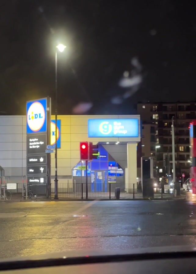 view from inside a car at night, stopped at a red traffic light. The street is wet, reflecting light from streetlights. Across the street is a Lidl supermarket and a building with "The Gym Group" sign. A red double-decker bus drives from right to left. A silver car passes from left to right. There are other cars in the distance. The video is slightly blurry due to rain on the windshield.