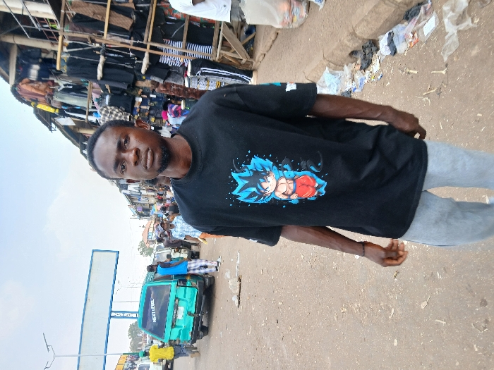 An outdoor image depicts a male individual standing on an unpaved road in a busy market area in Heany, Zimbabwe. The subject, an adult male with dark skin, short dark hair, a light mustache, and a short beard, faces the camera with a neutral expression. He wears a black short-sleeved t-shirt featuring a blue and red graphic of a character resembling "Goku" from Dragon Ball, and light grey sweatpants. A dark bracelet is visible on his left wrist. In the mid-ground to the left, a light blue minivan with "NEXT LEVEL" written on its rear window is visible, along with other vehicles and several pedestrians. A large, blank rectangular billboard on a pole structure and a street light are visible against a light sky in the far left background. To the right of the subject, a multi-tiered wooden market stall displays numerous articles of clothing, including shirts, trousers, and jackets. The ground along the right edge of the frame, adjacent to a curb, shows an accumulation of litter. The overall environment suggests a bustling commercial street under diffuse daylight.