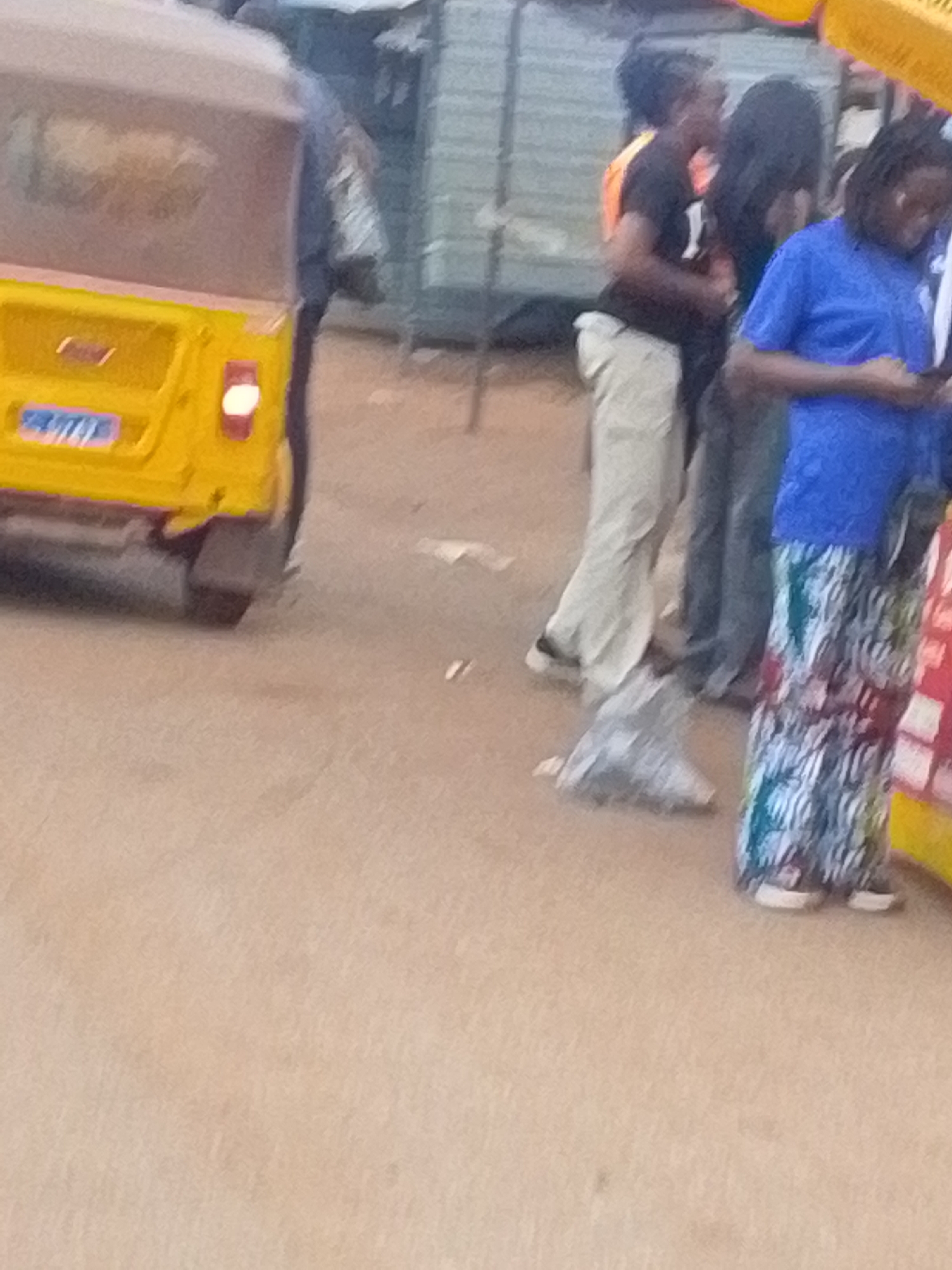 The image depicts a street scene in Tamale, Ghana. A yellow auto rickshaw is parked on the left side of the frame. A group of people stand on the right, one wearing a blue shirt and a patterned long skirt, appearing to use a mobile phone. Several other individuals are nearby. The ground is a dusty tan color. A vendor cart is visible in the background.
