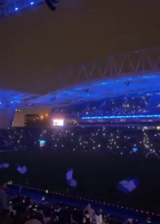 nighttime scene inside a stadium, likely for a sporting event, with a crowd of people holding up lights that appear to be from their phones