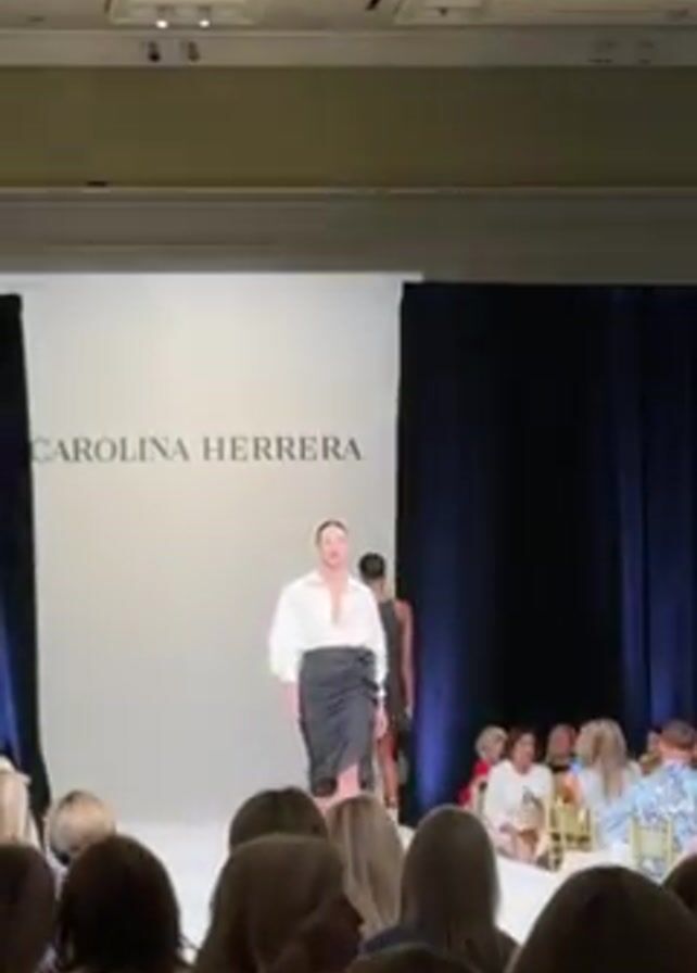 fashion show, with a model walking down the runway wearing a white blouse and a black skirt. Behind her, the name "CAROLINA HERRERA" is displayed on a white background. Another model, in a black dress, is walking behind. The audience, consisting mostly of women, is seated in the foreground. The runway is well-lit, and dark blue curtains are visible on the right side. The event is taking place indoors.