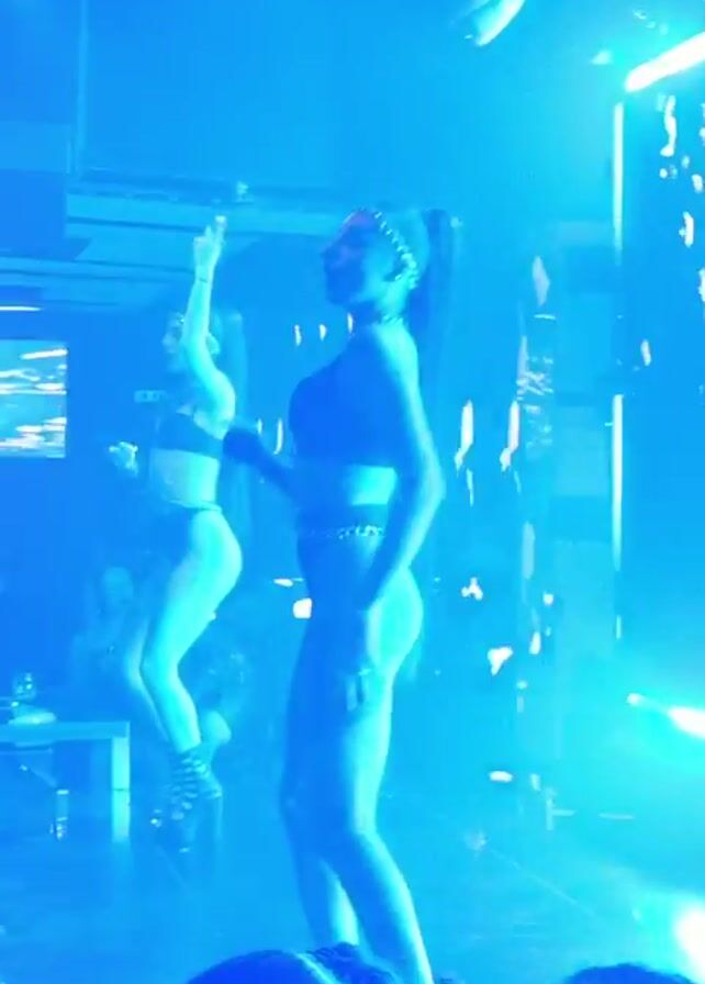 two scantily clad women dancing on a stage in a nightclub. They are wearing dark lingerie, chain belts, and matching headbands. The stage is lit with blue and purple lights, and there is a large screen behind them displaying abstract patterns. A crowd of people can be seen in the foreground, some of whom are filming the performance with their phones. The nightclub has modern decor with blue lighting accents.