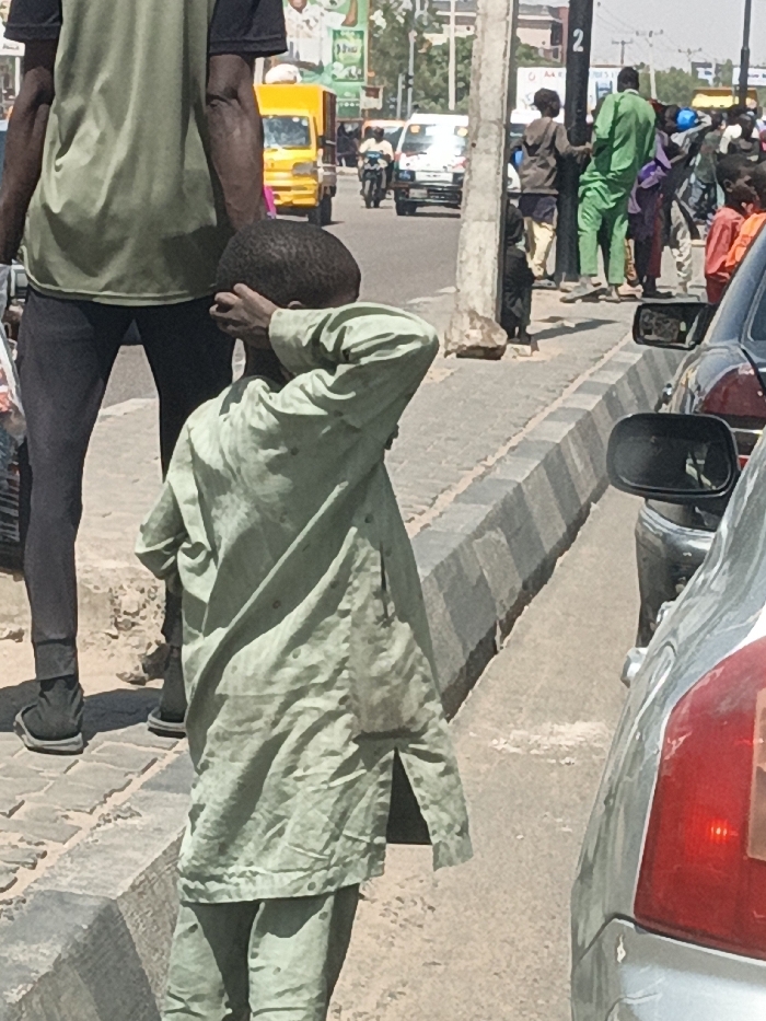 The image depicts an urban street scene in Hotoro, Nigeria, under bright sunlight. In the foreground, a young boy, dressed in a light green long-sleeved tunic and matching trousers, stands facing partially away from the viewer, his right arm raised with his hand covering his eyes. To his immediate left, the lower half of an adult male is visible, wearing a green shirt and dark trousers, standing on a grey stone-paved sidewalk. On the far right, the rear section of a silver car is present, with its red taillight and bumper visible. Adjacent to the silver car, a black vehicle's side mirror is seen. A striped concrete curb separates the paved sidewalk from a busy road. Along the sidewalk in the mid-ground, a black utility pole marked with the numeral "2" is visible. Several other individuals are standing or walking further down the sidewalk, including one person in a bright green outfit and another in light brown. On the street beyond the curb, traffic includes a yellow compact truck or tuk-tuk, a white van, and a motorcycle with a rider. The background features distant buildings, green trees, and large commercial signage with green and white elements. Strong shadows indicate a high sun.