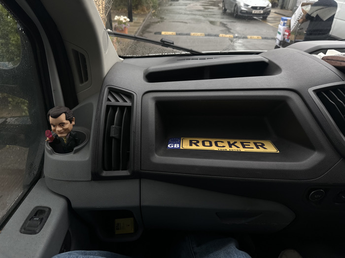 The image provides a forensic view from inside a vehicle's passenger compartment, looking forward through a rain-streaked windshield on an overcast day. The dashboard, predominantly dark grey plastic, features a bobblehead figure of Mr. Bean, holding a small red object, situated in a cup holder near the passenger-side door. A yellow novelty license plate with "GB" on a blue background on the left and "ROCKER YOUR AUTOS" printed across it is placed in an open compartment in the center of the dashboard. Part of a brown wallet is visible on the far right of the dashboard. The lower portion of the frame shows a person's lap, covered in blue denim jeans, indicating the perspective is from a seated individual. Outside the vehicle, the asphalt road is wet, featuring yellow speed bumps or markings. A silver car with a partially visible UK license plate (beginning "FJ...") is parked in the middle distance, facing away. To the right of the silver car, a white van is partially visible. An individual, seen from the back, wearing a dark shirt with a lighter pattern on the shoulders, is standing near the white van, carrying a stack of cardboard boxes. On the left side of the road, a pot containing white flowers is visible. The background suggests commercial or light industrial buildings. While the "GB" plate confirms the United Kingdom, the precise location within Hertsmere is not discernible from the image. However, the business name "ROCKER YOUR AUTOS" visible on the plate is associated with the wider Hertfordshire area, including towns adjacent to Hertsmere.