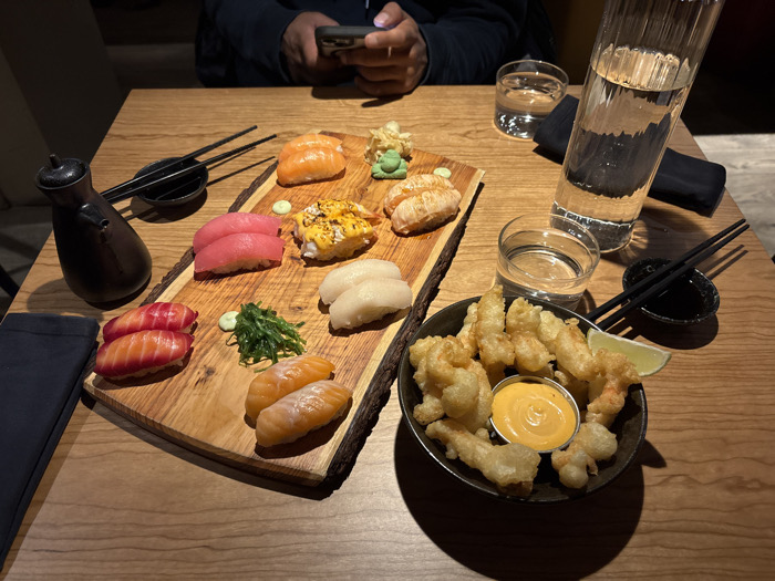 The image displays a dining table in a dimly lit restaurant, location Unknown, Unknown. The table surface is light-toned wood. In the upper center, the hands and forearms of a person are visible, holding a dark-colored smartphone, interacting with the device. A large, irregularly shaped wooden board occupies the center, presenting an assortment of nigiri sushi. This includes twelve pieces: four of bright orange salmon, two of deep pink tuna, two of a marbled red and orange fish, two of white fish (possibly scallops), one with a seared or cooked topping, and one with a yellow sauce and dark sprinkles. Two small dollops of light green paste (wasabi) and a small pile of green seaweed salad are also on the board. To the right, a tall, clear, fluted glass carafe, filled with water, stands with two clear drinking glasses also containing water. A pair of black chopsticks rests on a small black dish holding dark liquid. Another similar pair of chopsticks and a black dish are positioned on the upper left, next to a dark, tear-drop shaped dispenser, likely for soy sauce. A folded black cloth napkin is located in the lower left. In the lower right, a dark bowl contains multiple golden-brown, breaded, and fried food items, along with a small cup of orange-yellow dipping sauce and a lime wedge placed on the rim. Shadows from the various objects are cast across the table, consistent with the ambient lighting.