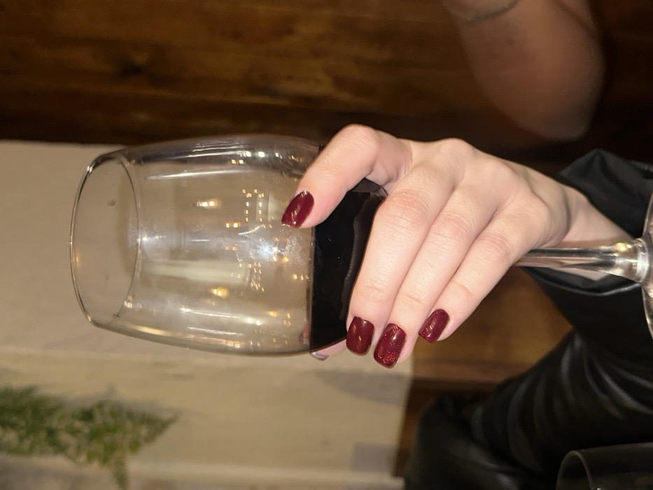 A hand with dark red, square-shaped nails holds a large wine glass. The glass appears mostly empty, with light reflecting off its inner surface. The person is wearing a black leather jacket or top. The background consists of a wooden surface, a light-colored wall, and a green decorative plant.