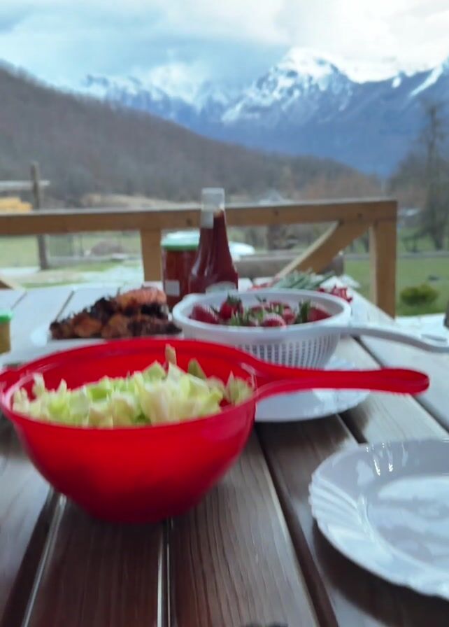 A camera pans up to show a table laden with food on an outdoor wooden deck. In the foreground are plates of food including grilled meat, a bowl of lettuce, and strawberries in a colander. Behind these are bottles of condiments and plates with what appear to be green onions and red peppers. The background shows a picturesque landscape of snow-capped mountains beneath an overcast sky. A wooden railing surrounds the deck, and glimpses of the surrounding landscape are visible.