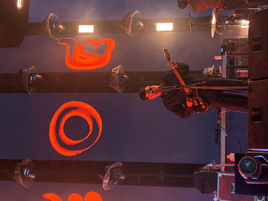 A musician with glasses plays an electric guitar on a stage. Behind him is a blue backdrop with red circular and heart-shaped designs. Stage lights and speakers are visible, along with what appears to be camera equipment. The image is rotated.