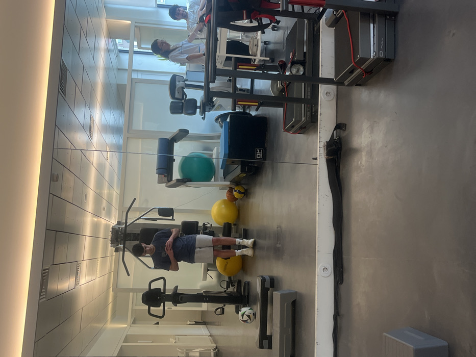 A mirrored gym reflects various workout equipment, including a treadmill, weight machines, exercise balls, and a stationary bike. Two people are near the treadmill in the background, while a young man stands closer, between a weight machine and a yellow exercise ball. A soccer ball rests near the stationary bike, and workout steps are visible. The floor is gray, and a black resistance band hangs on the mirror's edge.