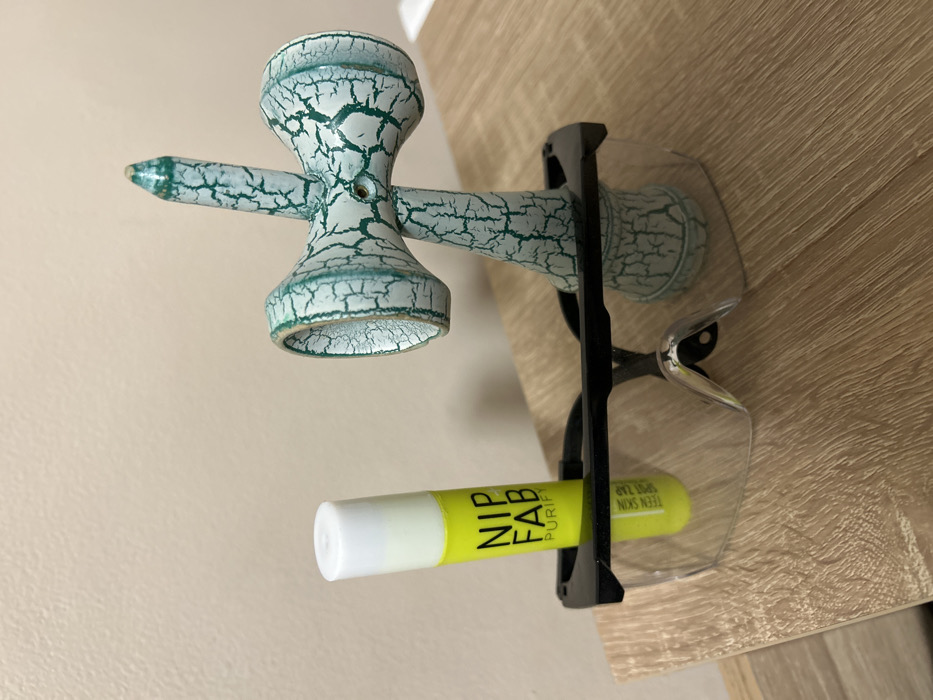 This image depicts an indoor scene with three primary objects arranged on a light-colored, wood-grain laminate surface, possibly a table or shelf. The background consists of a plain, light beige or pale pink wall. A pair of clear plastic safety glasses with black frames is positioned horizontally on the surface. Within the concave curve of the safety glasses, a cylindrical neon yellow tube with a white cap is standing upright. The tube is labeled "NIP+FAB PURIFY" in black text, and "TEEN SKIN SPOT ZAP" is visible lower down on the tube. To the right of the safety glasses, a kendama, a Japanese skill toy, stands vertically. The kendama features a distinctive white and teal-green cracked (craquelure) finish across its entire visible surface, including the spike and cups. The "tama" (ball) is not visible, suggesting it is either detached or out of frame. No people are visible in the image. The lighting appears to be even, without harsh shadows. The exact location within the city of Burgas, Bulgaria, cannot be determined from the provided visual information.