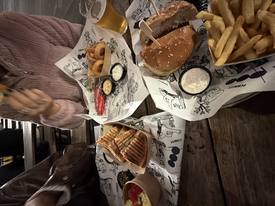 A table displays a variety of foods: a burger cut in half with a toothpick, a side of french fries, onion rings with two dipping sauces, panini sandwiches, and a small salad. A beer is also visible. The food is served on patterned paper. A person's arm wearing several rings and part of a jacket are also visible. The table surface appears to be made of wood.