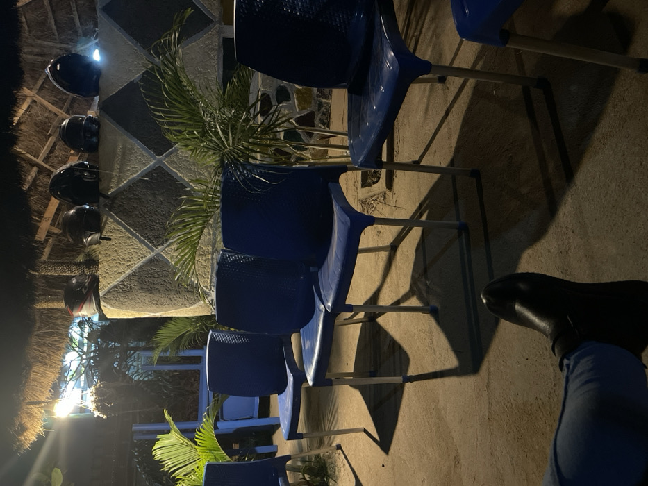 Outdoor scene with blue plastic chairs on a concrete surface, casting long shadows. A person's leg, clad in jeans and a black shoe, is visible in the lower right corner. In the background, a wall is adorned with a geometric pattern and a row of helmets is attached above. Plants are situated behind the chairs and under a thatched roof. The overall lighting is dim, highlighting the shadows and textures.
