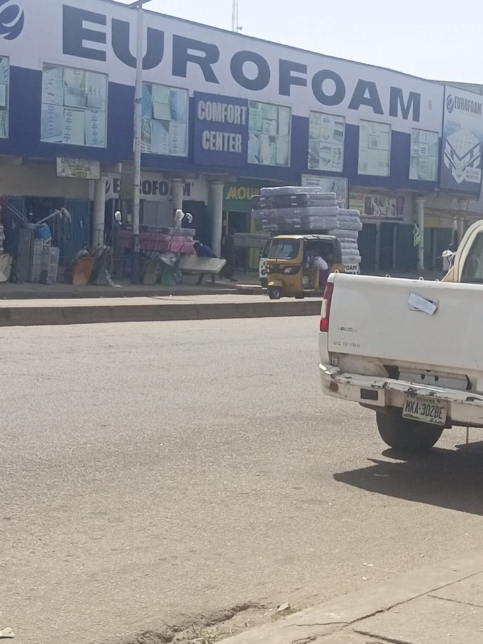 This image depicts a street scene in Sardauna, Nigeria, featuring a prominent commercial building and vehicular traffic. The primary structure is a two-story building with a blue and white facade. Large capital letters spelling "EUROFOAM" are displayed across the upper section. Below this, multiple windows exhibit stacked products, likely mattresses or foam. A sign reading "COMFORT CENTER" is also visible on the facade. At street level, various retail outlets are present, with one having a partial sign "MOUK". In the foreground, the rear of a white pickup truck is partially visible on the right. Its license plate, "MKA-302BE", is from "TARABA NIGERIA". The tailgate displays "LOCOVA UG 10/18N". On the opposite side of the street, parked near the building, is a yellow motorized tricycle, commonly known as a Keke Napep. It is heavily loaded with a tall stack of gray mattresses on its roof. A person is visible inside the driver's cabin of the tricycle. The sidewalk in front of the shops is cluttered with various objects, including what appear to be construction materials, metal structures, and a white bed frame or large bench. Indistinct human figures are present on the sidewalk. The scene occurs outdoors under bright daylight. The road surface is asphalt.