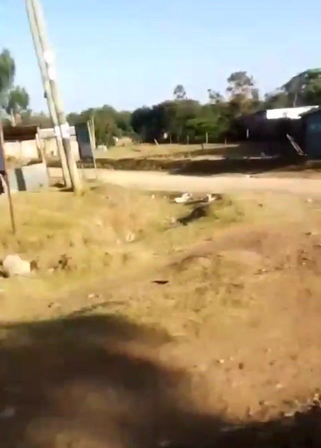 view from a moving vehicle traveling through a rural area. The road is dirt and unpaved, and the environment is mostly dry and dusty. There are several simple structures visible, including small shops and houses made from corrugated iron and wood. A large water tank and a blue building are also visible. The sky is clear and blue, indicating it is daytime. There is minimal activity, although some individuals are visible near the structures.