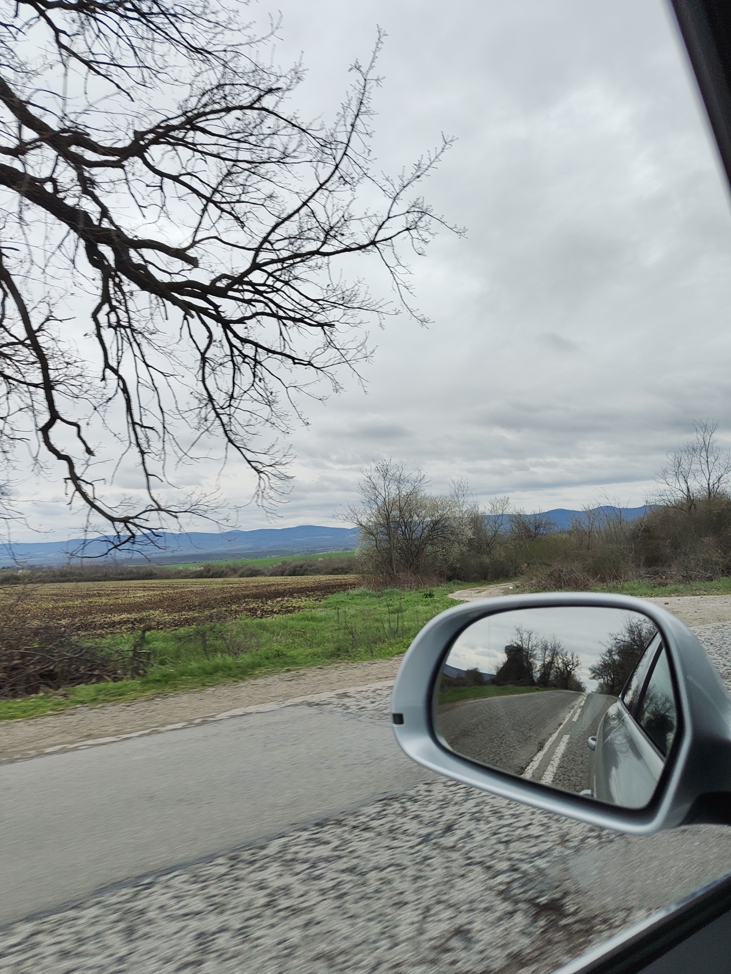 landscape taken from inside a moving car. In the foreground, the car's side mirror reflects the road behind. The road has two white lines painted on it. Further back, there is a field, some bushes, and a range of distant hills. Above, there is a cloudy sky and the bare branches of a tree. The location is identified as Mramoren, Bulgaria.