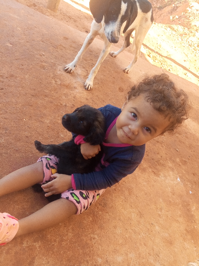 - "An outdoor scene in El Tacal, Venezuela, depicts a young child sitting on reddish-brown earth, holding a black puppy" by FM-qEkv12, licensed under CC BY 4.0