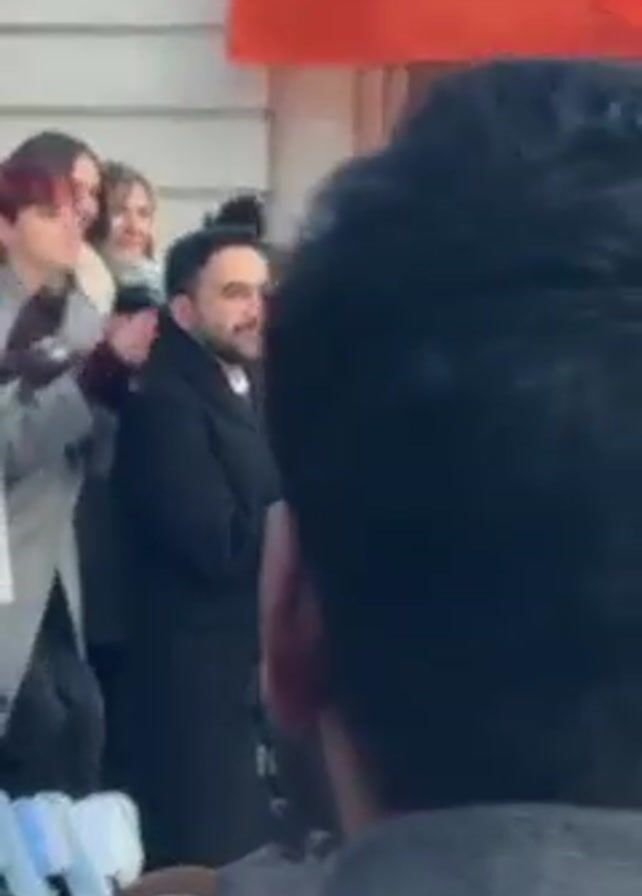 A group of people stands outside a white building, some clapping. A large orange flag hangs above them. The people are dressed in winter clothing, including coats and hats. A man in a black coat stands near the center of the group. A woman in a green coat and sunglasses is to his right. A camera with headphones is in the foreground. The ground is visible.