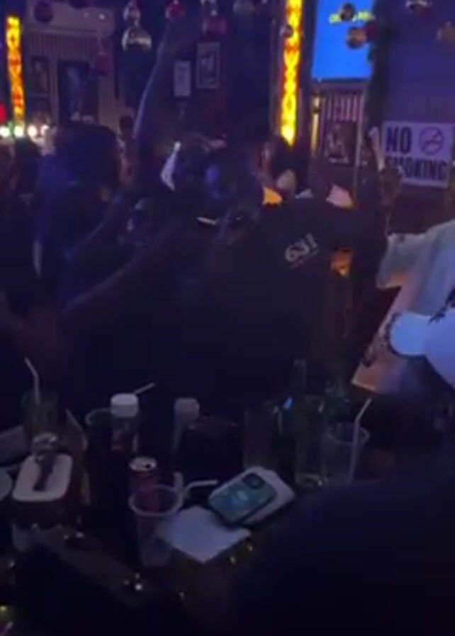 group of people in a bar-like setting, possibly a karaoke night. The lighting is dim, with colorful decorative lights and ornaments visible, indicating it could be during a festive season. A "NO SMOKING" sign is visible in the background. People are standing and gesturing, with at least two people holding microphones and appearing to sing or speak. The table in the foreground is cluttered with glasses, bottles, cans, and personal items like a phone and a bag. The focus is on the group singing, creating a lively and crowded atmosphere.