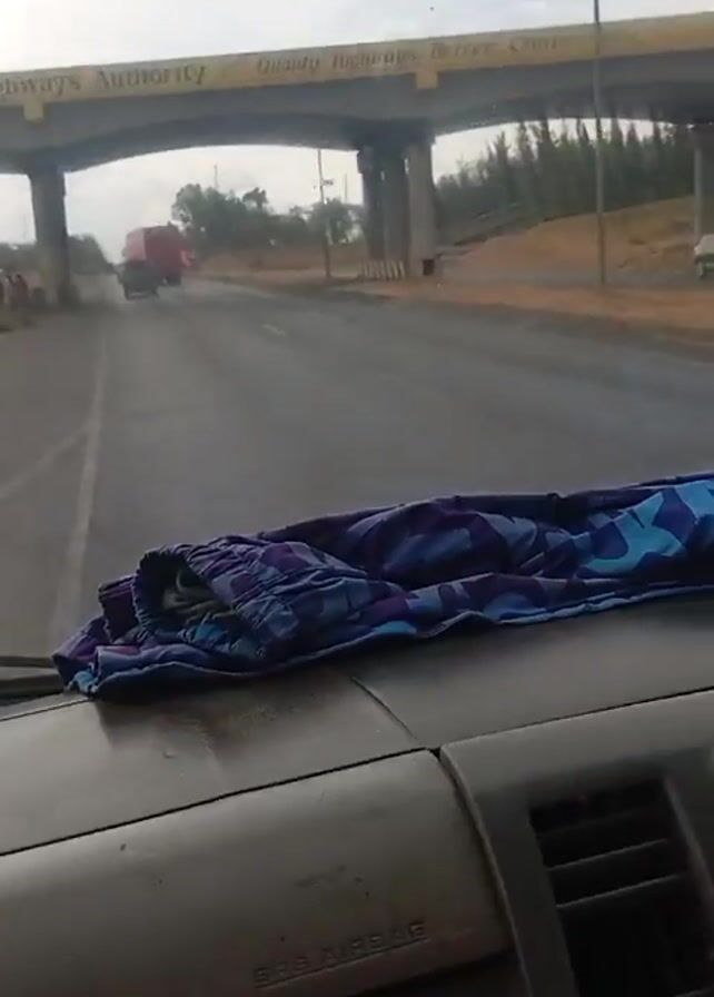 The video, taken from inside a vehicle, shows a highway overpass with the words "National Highways Authority" and "Quality Highways, Better Connections" displayed in yellow lettering