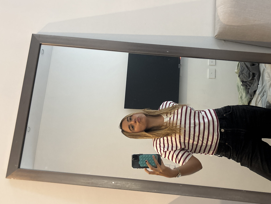 A mirror selfie captures a young adult female indoors in the city of Chablekal, Mexico. The subject, possessing long, straight, light brown hair, is clad in a white t-shirt with thin maroon horizontal stripes and dark-colored jeans. She holds a smartphone with a dark case and a teal textured pop-it accessory in her left hand, which is raised to photograph her reflection. Her lips are visibly pursed, and a metallic watch is present on her left wrist. The background visible within the mirror's reflection features a plain white wall. A black flat-screen television is mounted on the wall to the right of the subject's reflection. Two white electrical outlets are positioned on the wall below the television. In the lower right of the reflection, a light-colored upholstered bed or sofa is partially visible, topped with a rumpled green sheet and dark fabric. Two recessed ceiling lights are reflected in the upper corners of the mirror.