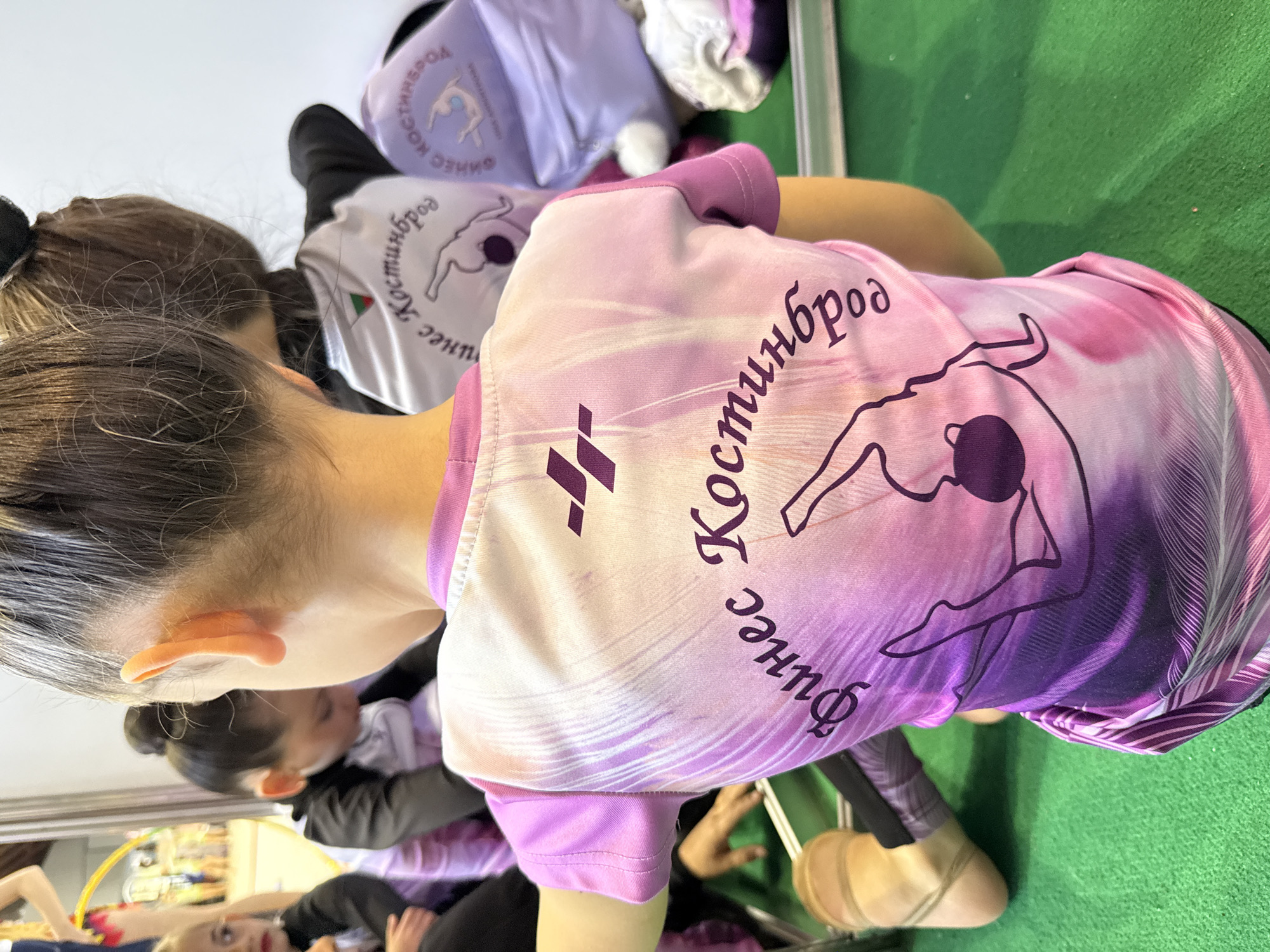 group of young female gymnasts wearing matching pink and white T-shirts with a logo of a gymnast performing a floor routine on the back, surrounded by purple Bulgarian script
