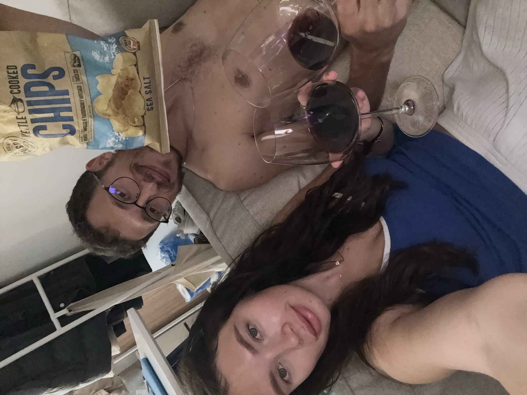 A photo shows a man and a woman reclining together. The man, with glasses and short dark hair, holds a bag of Kettle Cooked Chips (Sea Salt flavor). He appears to be shirtless. He is holding a wine glass. The woman, with long dark hair, is next to him, wearing a blue shirt. They both hold a glass of red wine. A messy shelving unit is partially visible in the background. The location is not specified in the image.