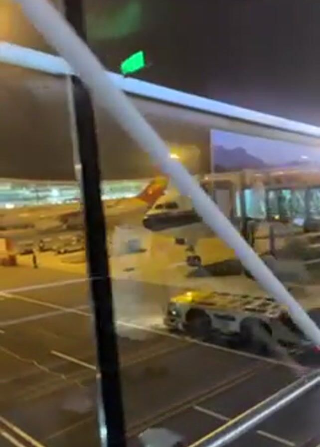 n airplane parked at an airport gate at night. The plane is white with red and orange accents and is connected to the gate by a jet bridge. There is ground crew visible around the plane and a yellow vehicle is parked nearby. The scene is viewed from inside the airport terminal through a window, which has some reflections on it. The lighting is primarily artificial.