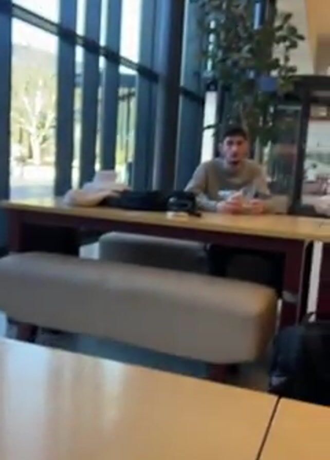 college cafeteria. A man with a beard sits at a table near a window. Other students are walking around the cafeteria. The interior is well lit and modern. There are potted plants in the space. The camera focuses on an empty table marked with a white stripe.