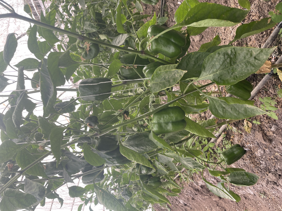 This image depicts the interior of a greenhouse or poly-tunnel facility in Jos, Nigeria. Numerous bell pepper plants (Capsicum annuum) are in active cultivation, heavily laden with green bell peppers varying in size and maturity. The plants are vertically supported by a trellising system, evidenced by white strings extending from an overhead framework, which is partially visible against a bright, diffused light source. The ground beneath the plants consists of reddish-brown soil, with thin, dark drip irrigation lines visible along the base of the plant rows. No individuals are present within the captured frame.