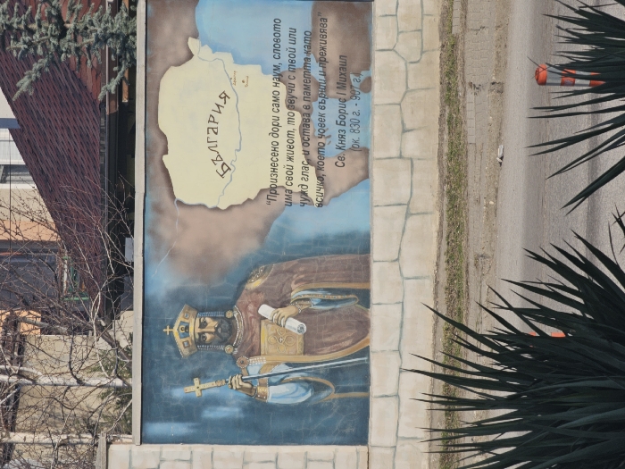 A mural is depicted on a light-colored wall with a faux-stone base, located in Silistra, Bulgaria