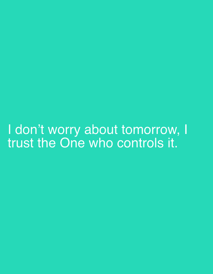 The image displays a digital graphic on a solid teal background. No people, subjects, objects, actions, or interactions are visually depicted. The environment consists solely of a uniform color field. White sans-serif text is centrally aligned in the lower-middle portion of the image, reading: "I don't worry about tomorrow, I trust the One who controls it." The scene is located in the city of Saint-Germain-en-Laye, France.
