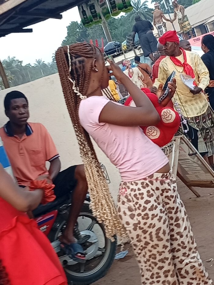 A woman with long blonde braids and leopard-print pants holds a phone and a stuffed bear while taking pictures. An older man in a red head wrap and yellow shirt also holds a phone in the background, with other people visible in the distance. A man sits on a motorcycle to the left, and there's a wall or building behind him. There are advertisements above in the background.